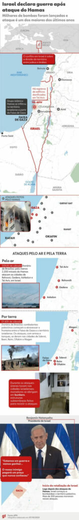 O grupo Hamas reivindicou o ataque e afirmou se tratar do início de uma grande operação para a retomada do território. O conflito, que chega ao terceiro dia nesta segunda-feira, provocou a morte de ao menos 1.200 pessoas, sendo 700 em Israel, 493 na Faixa de Gaza e 7 na Cisjordânia, segundo o balanço mais recente.