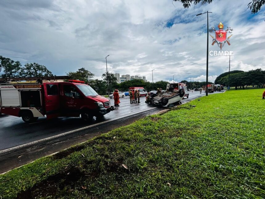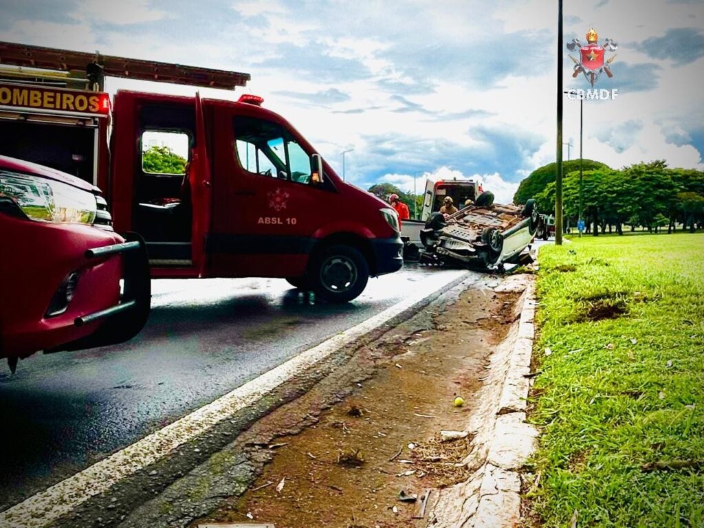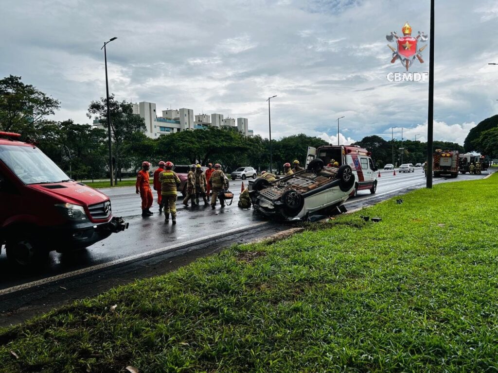 O veículo ficou de cabeça para baixo no meio de uma das vias, na altura da quadra 112. Nas imagens divulgadas pelo Corpo de Bombeiros Militar do Distrito Federal (CBMDF), é possível ter uma dimensão do caso. Confira a seguir: