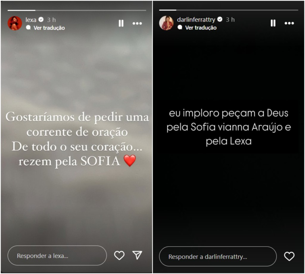 “Gostaríamos de pedir uma corrente de oração de todo o seu coração… rezem pela Sofia”, escreveu a cantora em uma publicação nos Stories do Instagram.