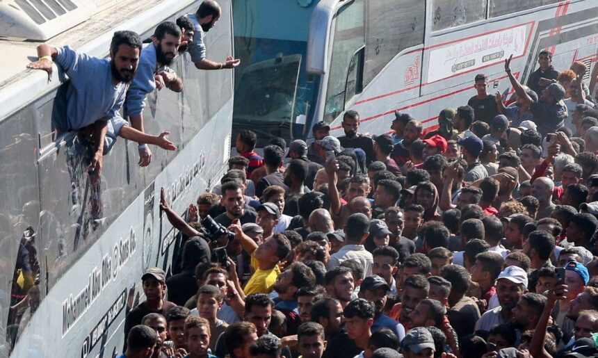 Parte dos libertados chegou de ônibus na Cisjordânia e em Gaza, após o Hamas ter libertado os últimos 20 reféns vivos levados durante os ataques de 7 de outubro de 2023.
