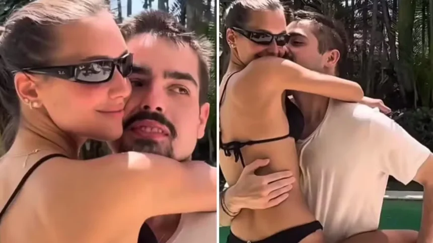 Nas imagens, publicadas nas redes sociais, o casal aparece em clima de intimidade em uma área externa com piscina. De biquíni, Alexia pula no colo de João enquanto os dois trocam carícias, ao som de uma música da banda Gilsons.