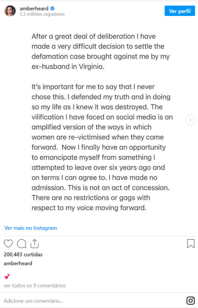 Porém, novos desdobramentos mostram, que, de fato, o conflito judicial acabou, com os dois atores entrando em um acordo. Através de três longos posts no Instagram, Heard admitiu ter desistido do caso em uma “decisão muito difícil”, e afirmou: “eu tomo essa decisão porque perdi a fé no sistema legal americano […]”.