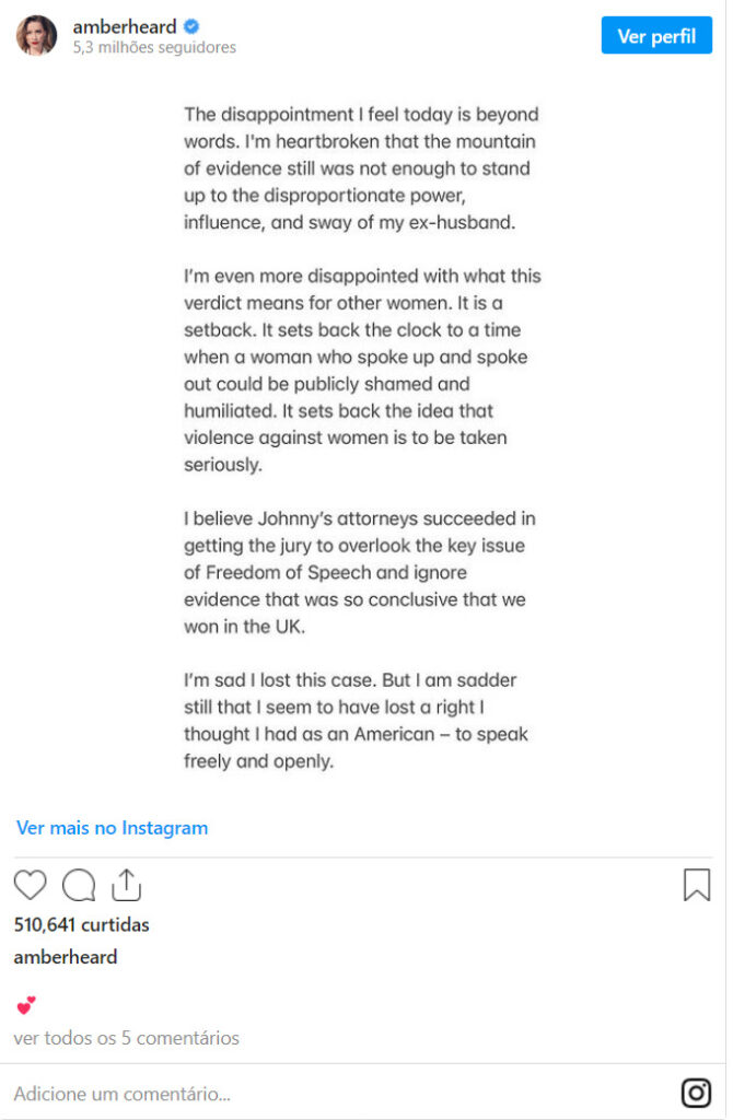 Ao desfecho do caso, Heard disse que recorreria e que seguiria na luta. “Eu não os culpo. Eu realmente entendo. Ele é um personagem amado e as pessoas sentem que o conhecem”, disse ela sobre o júri.