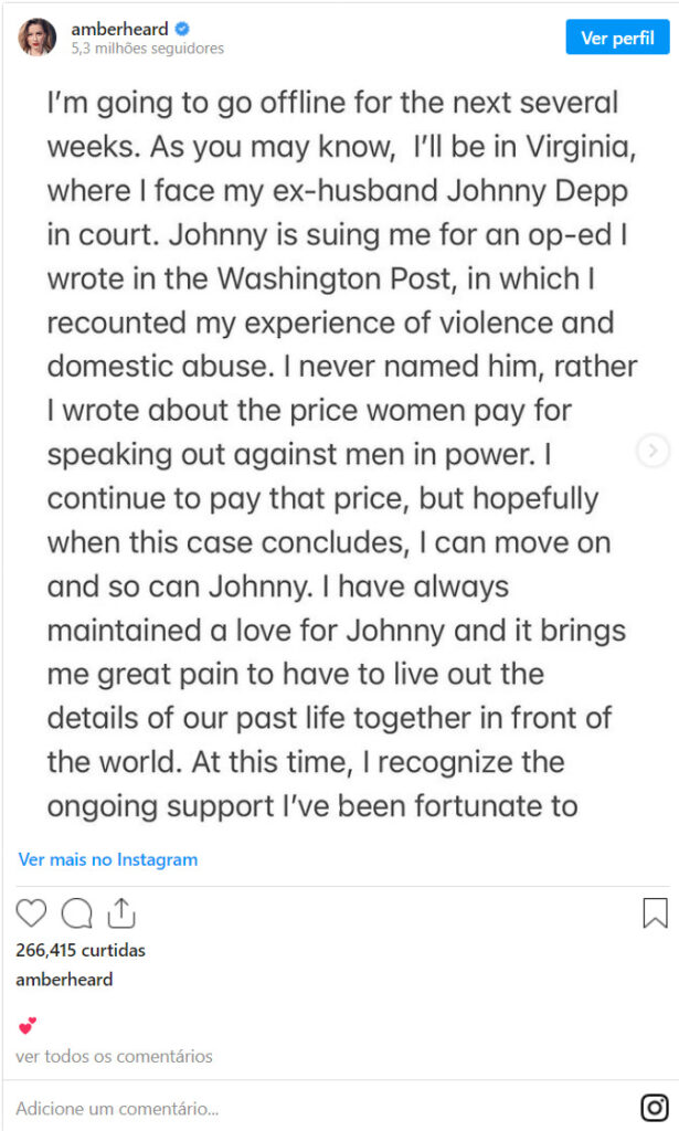 E, caso você não saiba, aqui vai um pouco de contexto: após terem se conhecido no set do filme Diário de um Jornalista Bêbado (2011), os dois iniciaram um relacionamento amoroso e se casaram em 2015. O matrimônio se encerrou em 2017, todavia, depois de diversas polêmicas, que envolviam abusos físicos, psicológicos, traições e mentiras.