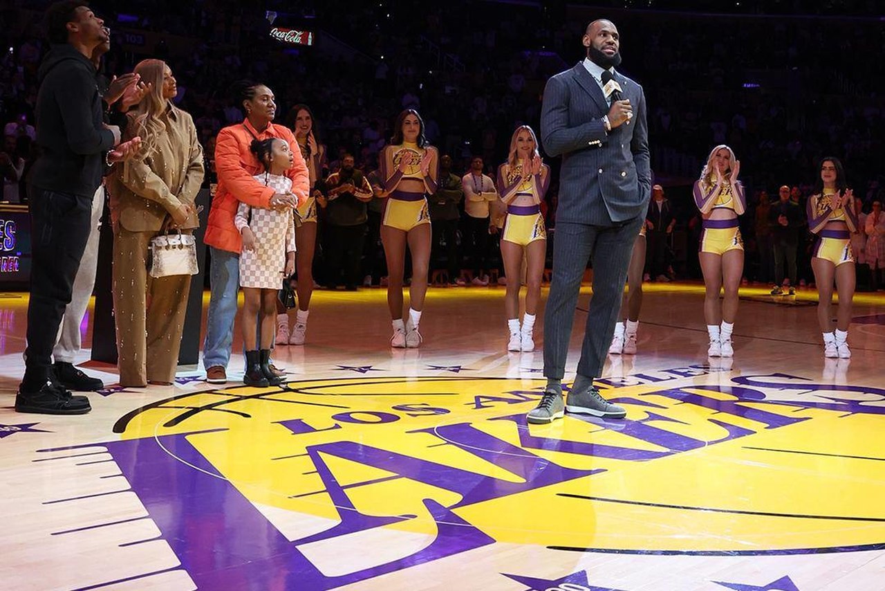 Antes do início da partida na Crypto.com Arena, LeBron foi ovacionado pela torcida e recebeu homenagens no centro da quadra, ao lado da família. Ele também foi presenteado por um dos seus patrocinadores com um tênis especial, feito de mármore e detalhes em ouro. O astro entrou para a história de vez da NBA ao quebrar o recorde de pontos da competição na quarta. Ele chegou aos 38.390 pontos, superando a marca de 38.387 que pertencia à lenda Kareem Abdul-Jabbar.