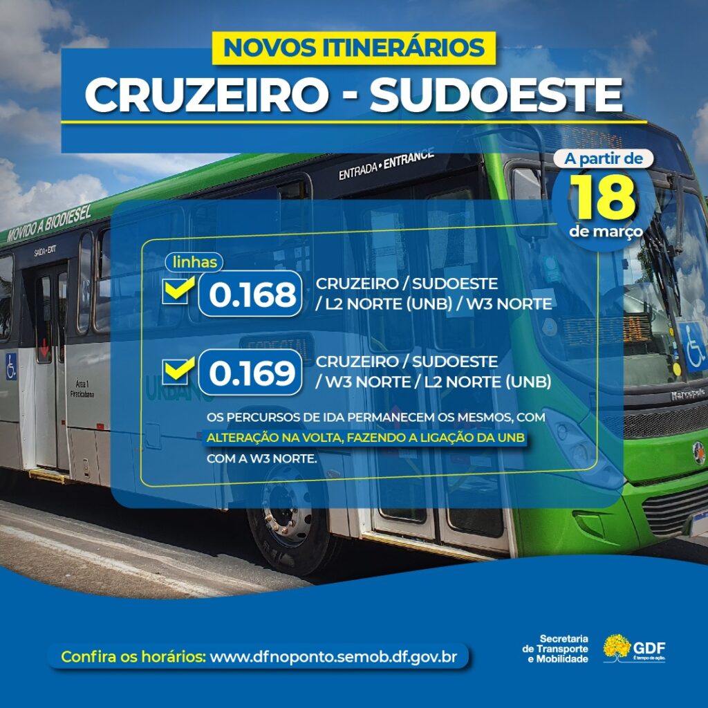 As linhas de ônibus 0.168 e 0.169, que vão do Cruzeiro e do Sudoeste para a Asa Norte (pelas vias W3 e L2, respectivamente), terão mudanças de trajeto e reprogramação de horários a partir desta segunda-feira (18). O objetivo das intervenções da Secretaria de Transporte e Mobilidade (Semob-DF) é otimizar o serviço, com melhor aproveitamento da frota.