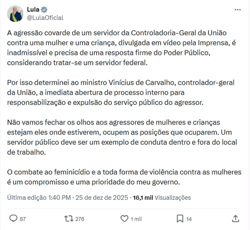 Em publicação nas redes sociais (veja a íntegra abaixo), Lula afirmou que o episódio é “inadmissível” e determinou ao ministro Vinícius Marques de Carvalho, controlador-geral da União, a abertura imediata de processo interno para responsabilização e expulsão do agressor do serviço público.