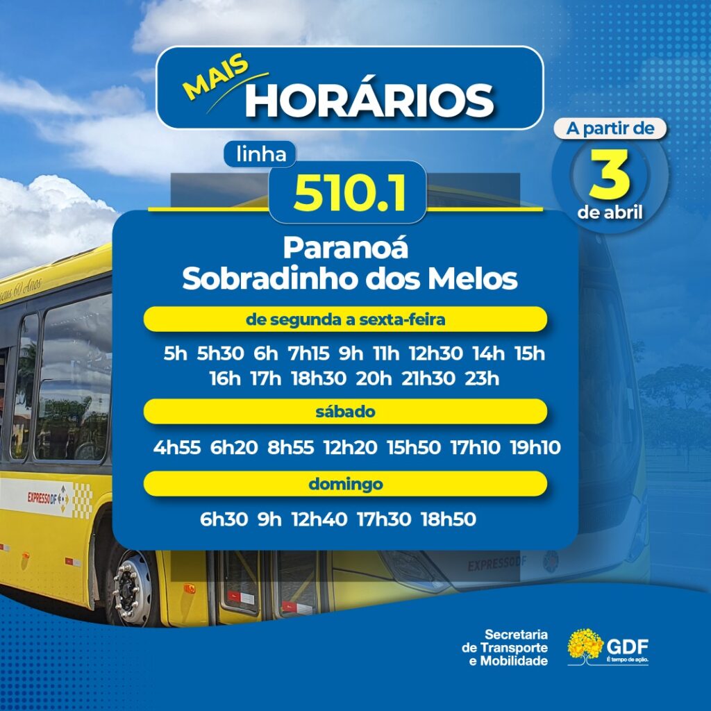 A partir de segunda-feira (3/4), os usuários de transporte público coletivo do Núcleo Rural Sobradinho dos Melos, na região administrativa do Paranoá, terão à disposição mais viagens de ônibus. A Linha 510.1, que faz trajeto entre o Paranoá e Sobradinho dos Melos, vai operar com ajustes e acréscimo nos horários.