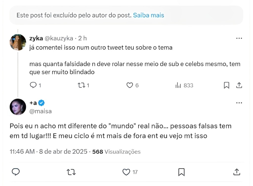 “Já comentei isso num outro tweet teu sobre o tema. Mas quanta falsidade não deve rolar nesse meio de sub e celebridades mesmo, tem que ser muito blindado”, opinou a internauta, que recebeu atenção da atriz.