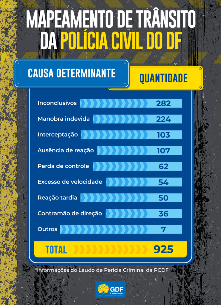 Um mapeamento feito pelo Instituto de Criminalística da Polícia Civil do Distrito Federal (PCDF) auxiliará nas ações de trânsito do Governo do Distrito Federal (GDF) e na conscientização dos motoristas do DF. O documento aponta as principais regiões com ocorrências de acidentes no ano de 2022 e as causas determinantes dos sinistros. Manobras indevidas e interceptação – a famosa “fechada” – estão entre as principais responsáveis pelos acidentes de trânsito.