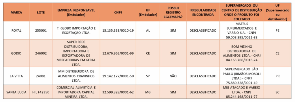 Confira as marcas e lotes inspecionados que foram considerados impróprios: