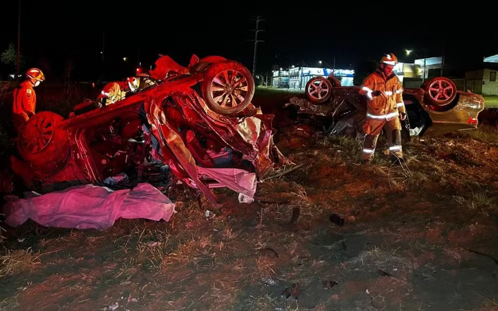 De acordo com o Corpo de Bombeiros do DF, o acidente envolveu dois veículos: um Nissan Kicks, de cor cinza, e um Audi A3, de cor preta. Com o impacto, os dois carros capotaram e pararam às margens da rodovia.
