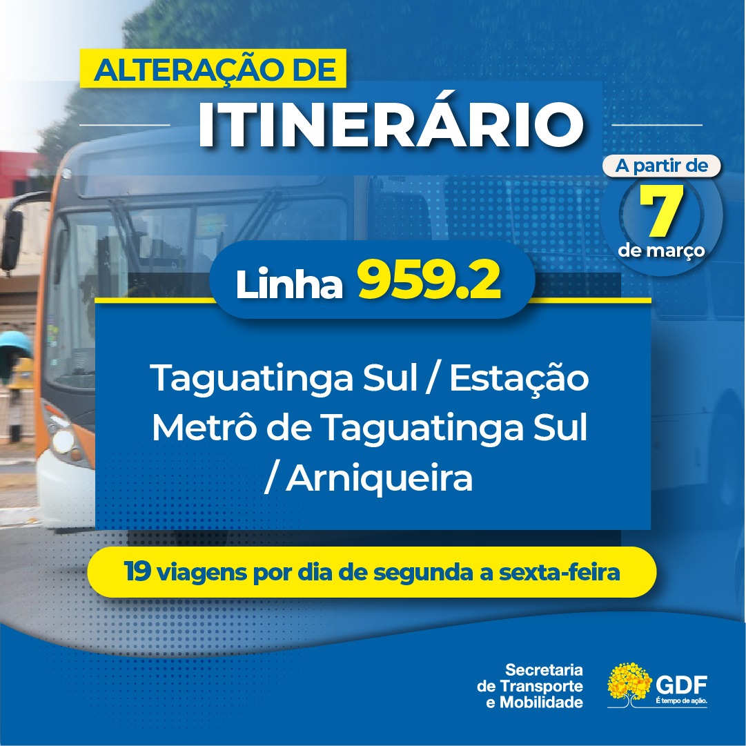 A partir de segunda-feira (7), a linha de ônibus 959.2, que faz o percurso circular entre o Terminal de Taguatinga Sul e Arniqueira, terá a rota ampliada. O objetivo é que os veículos da linha sigam até a estação do metrô mais próxima para que a integração com o Plano Piloto e com as outras regiões da cidade sejam facilitadas.