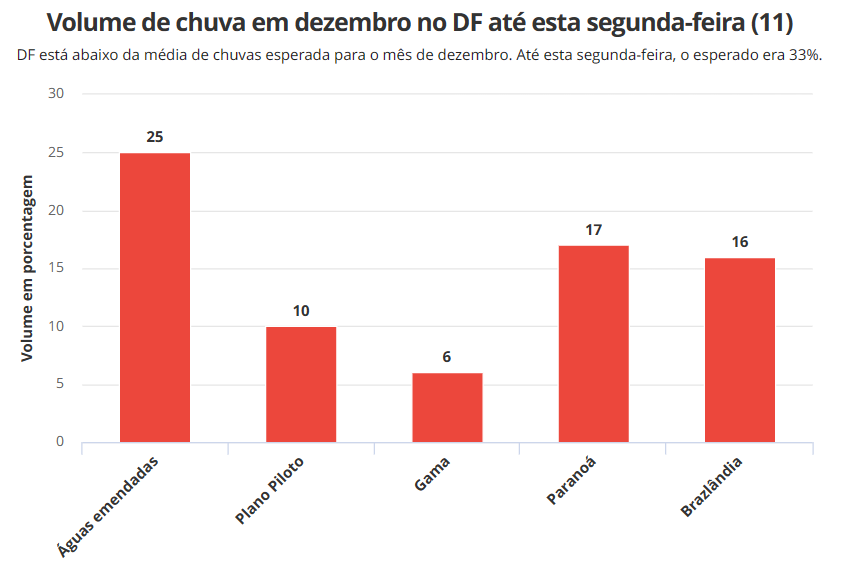 Até esta segunda-feira (11), o DF está abaixo da média de chuvas esperada para o mês de dezembro. Segundo Bahia, era para ter chovido ao menos 33% do esperado para o mês, mas o maior índice foi de 25%, registrado em Águas Emendadas.