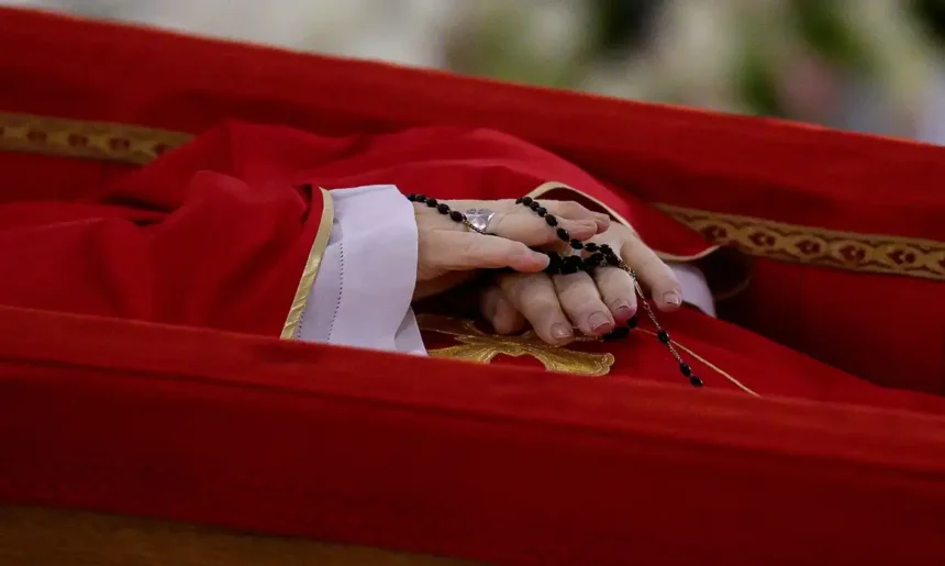 De acordo com a Santa Sé, o caixão foi colocado em frente ao Altar da Confissão, na Basílica de São Pedro, onde o coro cantou a Ladainha dos Santos em latim “para o repouso de sua alma”. O cardeal camerlengo Kevin Farrel conduziu uma breve liturgia que incluiu uma leitura do Evangelho de João sobre o amor de Jesus por seus discípulos.