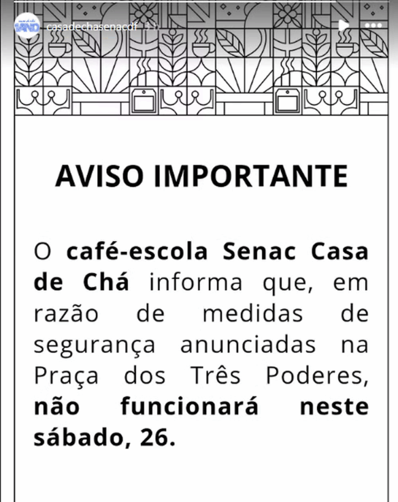 Com o fechamento da Praça dos Três Poderes, atrações como a Casa de Chá – cafeteria no subsolo da praça, idealizada por Oscar Niemeyer – também ficaram inacessíveis ao público neste sábado. Até o meio-dia, o governo do DF não informava uma previsão de reabertura do espaço.
