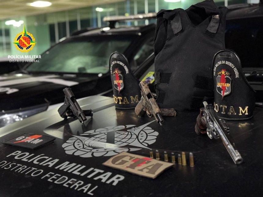 No local, foram apreendidas três armas de fogo, munição e um colete balístico. O suspeito possuía extensa ficha criminal, incluindo homicídio, tráfico de drogas, porte ilegal de arma de fogo, adulteração de veículo automotor e roubos.