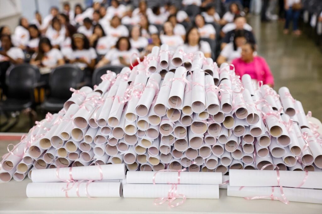 A Secretaria da Mulher (SMDF), em parceria com a Secretaria de Educação (SEEDF), o Ministério da Educação (MEC) e o Programa Nacional de Acesso ao Ensino Técnico e Emprego (Pronatec), entregou, na tarde desta segunda-feira (16), certificados para 240 alunas do Programa Mulheres Mil do DF. A formatura ocorreu no auditório da Eape na 907 sul e contou com a presença da vice-governadora Celina Leão, da secretária da Mulher, Giselle Ferreira, da secretária de Educação, Hélvia Paranaguá, e do gerente de Projeto da Secretaria de Educação Profissional e Tecnológica (Setec/MEC), Marcos Lael Oliveira Alexandre.