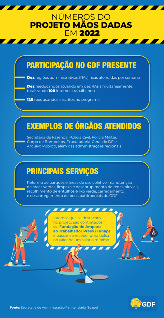 O sucesso do programa GDF Presente – de manutenção e melhoria da infraestrutura das regiões administrativas do Distrito Federal – não seria possível sem uma contribuição importante: a do projeto Mãos Dadas. A iniciativa, da Secretaria de Administração Penitenciária (Seape), direciona reeducandos do sistema prisional para realizar as pequenas obras do dia a dia das cidades.