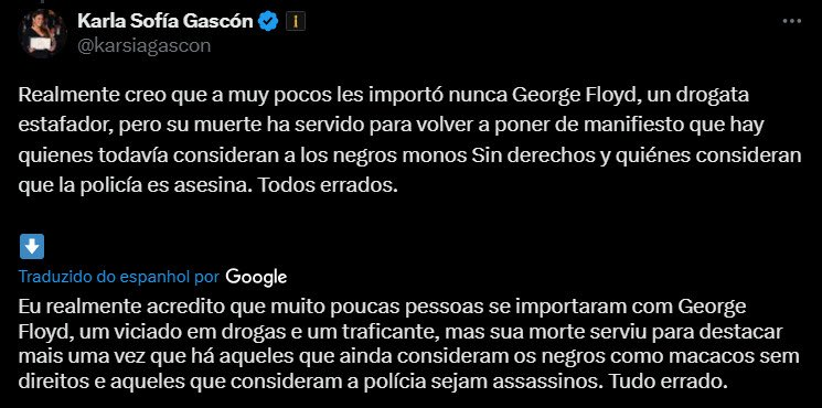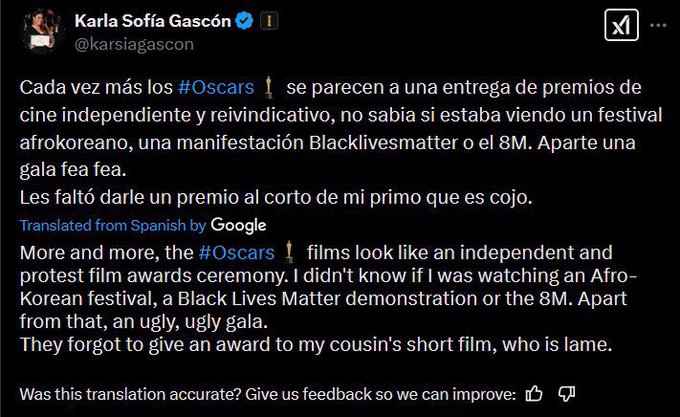 Em outras postagens, Gascón ainda reproduz falas racistas contra o grupo sul-coreano BTS, chamando-os erroneamente de chineses e a se mostra bastante incomodada com a inclusão e diversidade no Oscar, premiação na qual seu filme foi indicado a 13 categorias.