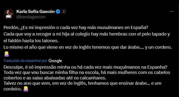 “Desculpe, é só impressão minha ou há cada vez mais muçulmanos na Espanha? Toda vez que vou buscar minha filha na escola, há mais mulheres com os cabelos cobertos e as saias abaixadas até os calcanhares. Talvez no ano que vem, em vez de inglês, tenhamos que ensinar árabe”, afirma.