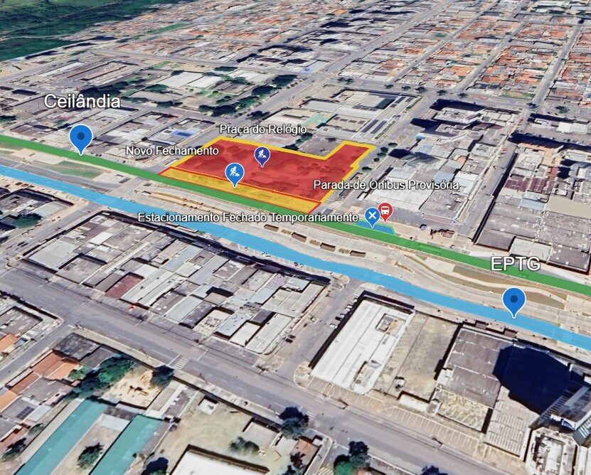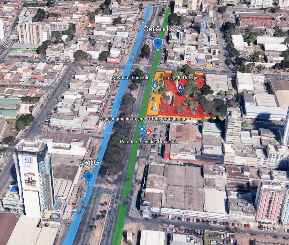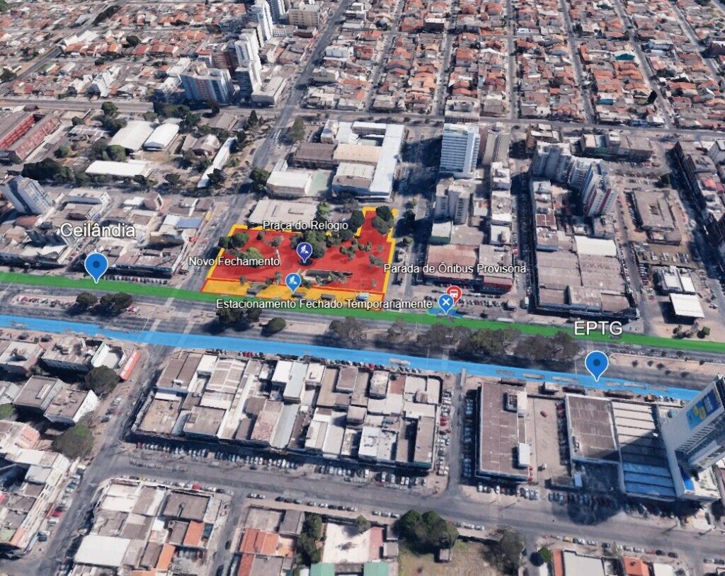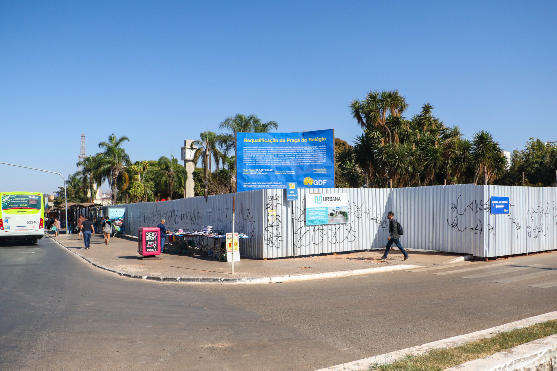 As obras da Praça do Relógio, em Taguatinga, vão modificar nesta semana o fluxo de veículos e pedestres no local. Para garantir o avanço dos trabalhos, parte do canteiro de obras será remanejado, o que resultará na ocupação de uma faixa de rolamento da via central.