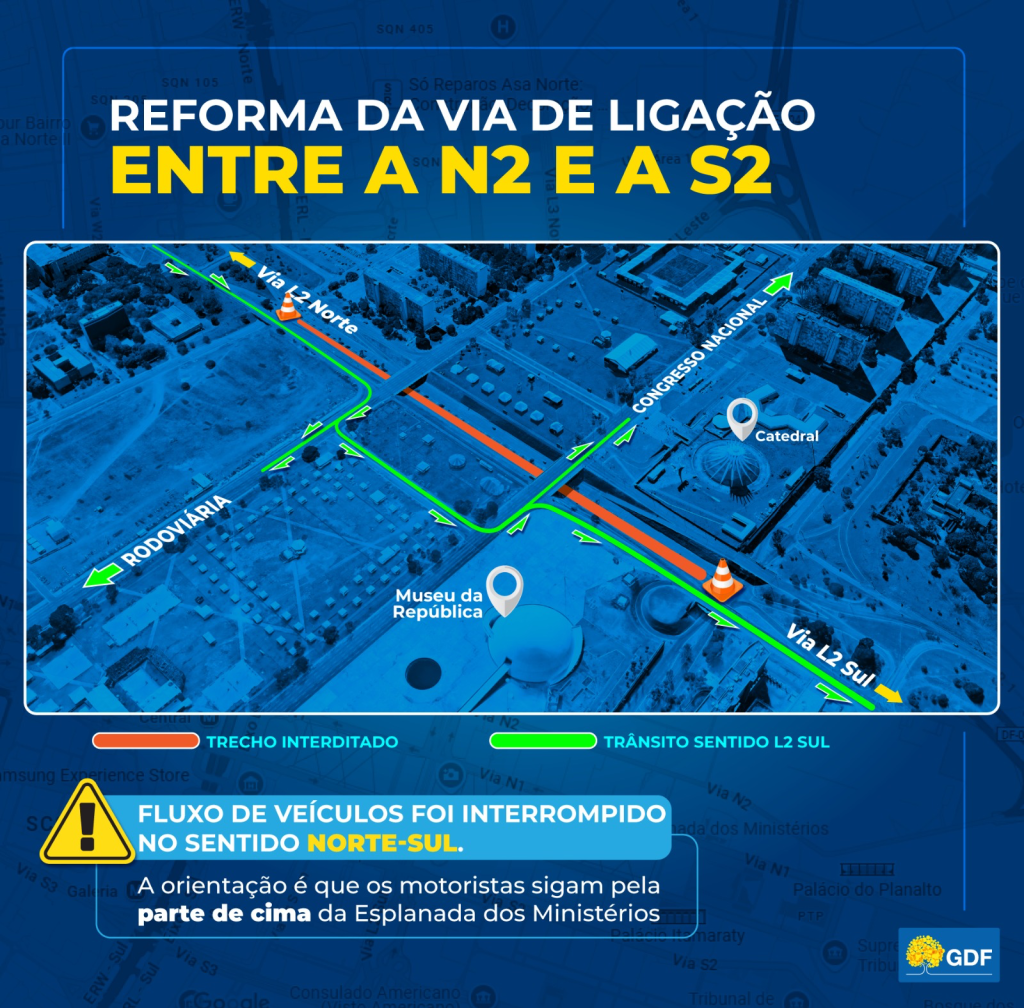 O Governo do Distrito Federal iniciou, na terça-feira (4), a reforma da pista que faz a ligação entre as vias N2 e S2, na Esplanada dos Ministérios. O trecho tem 600 metros e costuma ser utilizado por motoristas que desejam seguir da L2 Norte para a L2 Sul – e vice-versa.