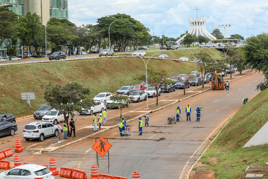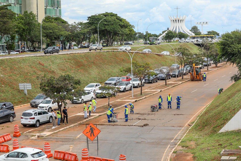 Um dos responsáveis pela obra, o engenheiro Jarbas Silva, do DER, detalhou que a área foi toda mapeada. As placas com danos severos serão demolidas enquanto outras ainda terão uma parte aproveitada. “Fora isso, a gente também vai fazer a resselagem das juntas para evitar aquele desconforto na transição de uma placa para outra com o rolamento dos pneus dos veículos. Em conjunto com essa ação, a Novacap [Companhia Urbanizadora da Nova Capital] vai fazer um trabalho de limpeza das bocas de lobo e um tratamento nas placas embaixo dos viadutos e na calçada do canteiro central”, explicou.
