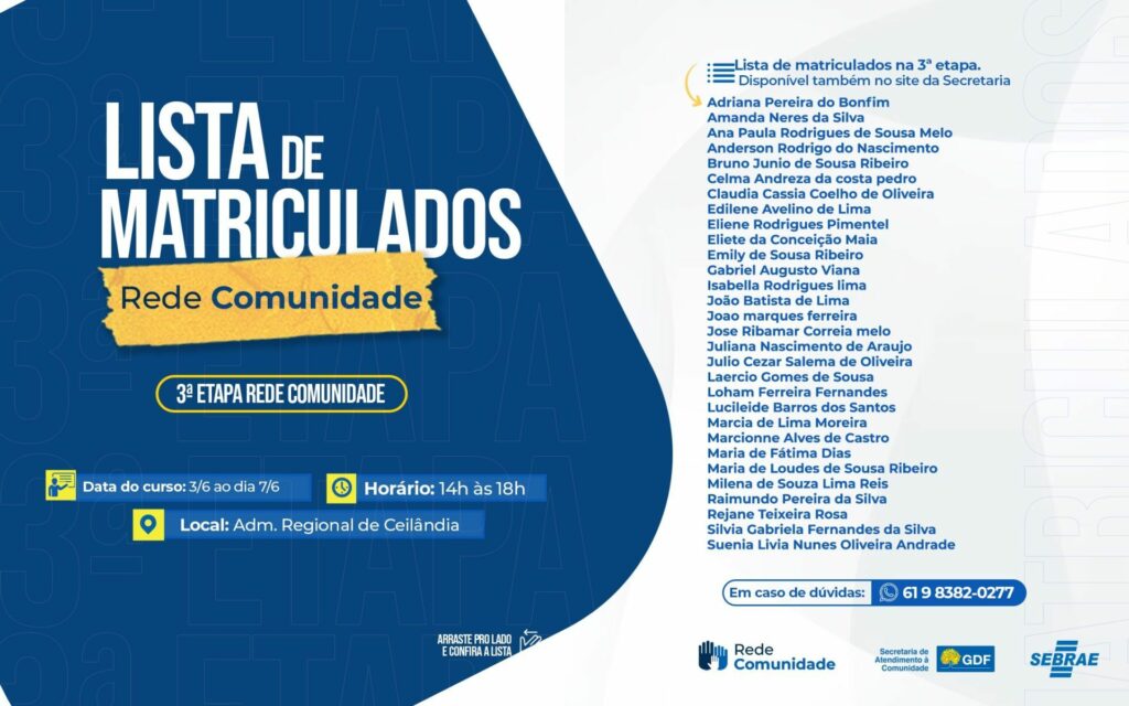 Confira, abaixo, a lista de matriculados para o Rede Comunidade em Ceilândia.
