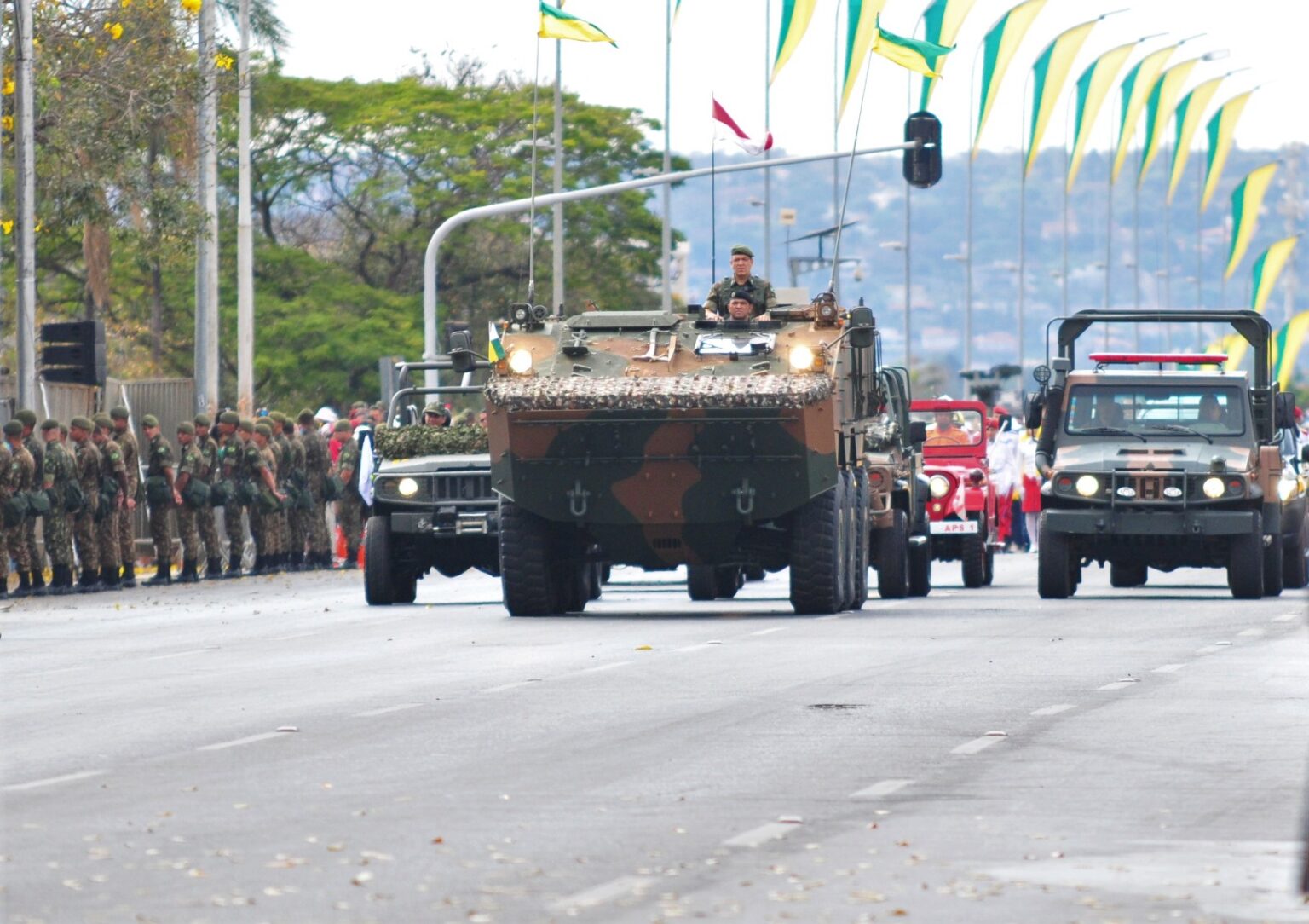 A PMDF e o Departamento de Trânsito do DF (Detran) coordenarão o bloqueio de vias e o trânsito na região central. A partir das 21h de quarta-feira (6), será proibido o trânsito de veículos na Esplanada dos Ministérios. O bloqueio será entre a alça leste da Rodoviária do Plano Piloto e o 1º Grupamento de Bombeiro Militar. A partir das 6h de quinta-feira (7), o trecho entre o 1º Grupamento do CBMDF, passando pela L4 Sul, até as proximidades da Ponte JK (sentido Plano Piloto – Lago Sul), estará suspenso para abrigar os veículos blindados que participarão do desfile.