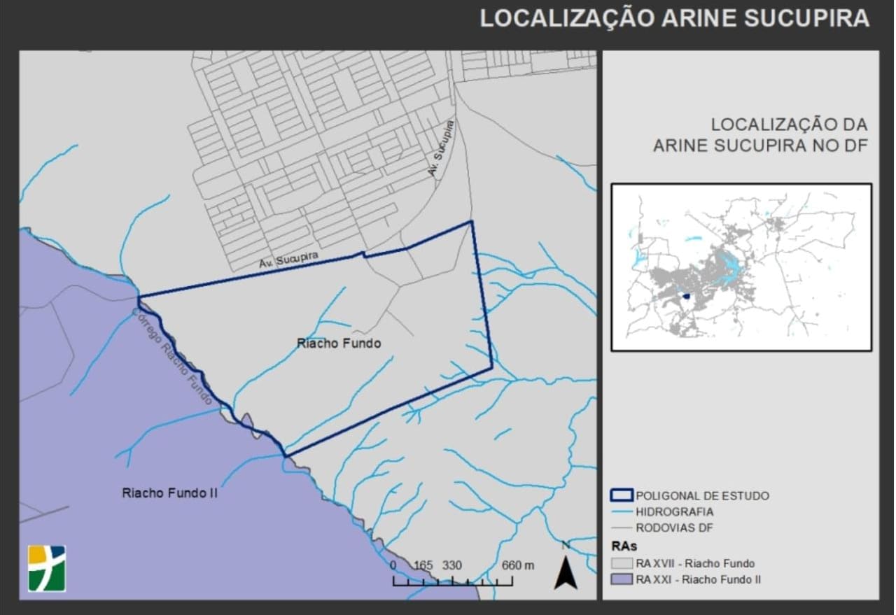 Com o objetivo de avançar na regularização fundiária da Área de Regularização de Interesse Específico (Arine) Sucupira, no Riacho Fundo, a Agência de Desenvolvimento do Distrito Federal (Terracap) publicou licitação pública para contratar serviços técnicos de engenharia. Os trabalhos envolverão estudos necessários ao licenciamento ambiental e os projetos de infraestrutura, etapas indispensáveis para o registro cartorial da área de 148,22 hectares.