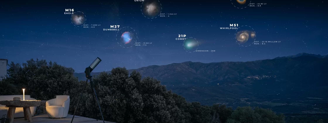 Para usar esse tipo de observatório, basta ligar o dispositivo, selecionar o objeto alvo de observação e começar. Não há necessidade de nenhum alinhamento manual, pois o telescópio capta até mesmo a luz fraca de galáxias e nebulosas distantes, registra-a em um sensor supersensível e a projeta através de uma tela OLED. Além disso, a imagem captada pode ser transmitida para um smartphone ou tablet.