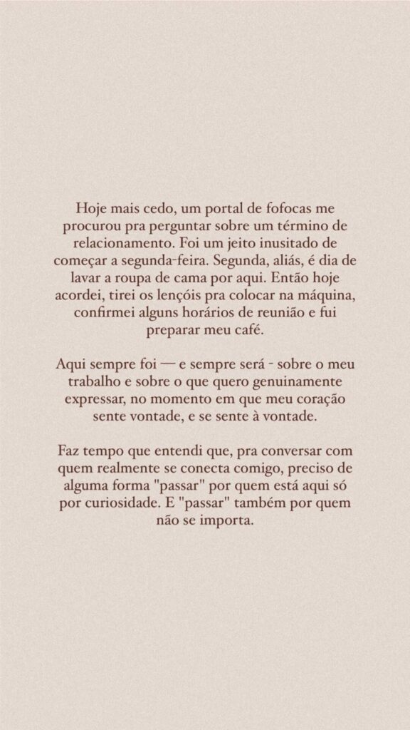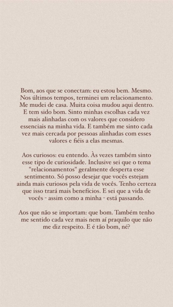“Me mudei de casa. Muita coisa mudou aqui dentro. E tem sido bom. Sinto minhas escolhas cada vez mais alinhadas com os valores que considero essenciais na minha vida. E também me sinto cada vez mais cercada por pessoas alinhadas com esses valores e fiéis a elas mesmas”, explicou.