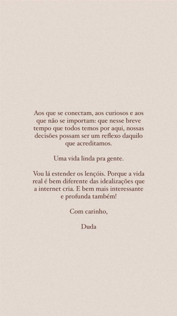 Duda ainda fez uma reflexão: “Aos que se conectam, aos curiosos e aos que não se importam: que nesse breve tempo que todos temos por aqui, nossas decisões possam ser um reflexo daquilo que acreditamos. Uma vida linda pra gente. Vou lá estender os lençóis. Porque a vida real é bem diferente das idealizações que a internet cria”, concluiu.