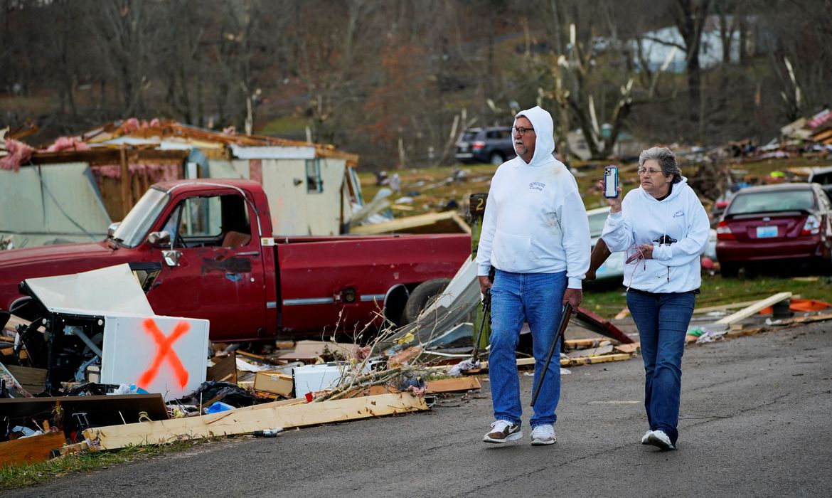 Algumas das piores destruições ocorreram em Mayfield, uma pequena cidade de cerca de 10 mil habitantes no extremo oeste de Kentucky, onde o estado converge com Illinois, Missouri e Arkansas.