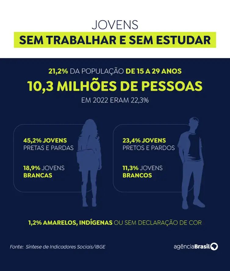 No país, 10,3 milhões de jovens estavam sem estudar e sem trabalhar em 2023, o que equivale a 21,2% da população de 15 a 29 anos. Esse é o nível mais baixo registrado desde 2012, quando começou a pesquisa.