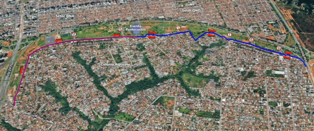 Na região do Taguaparque e de Vicente Pires, durante a saída do evento, o fluxo de veículos na Avenida Contorno do Parque, iniciando próximo ao Ginásio de Esportes, estará com sentido único na direção da EPTG e em sentido duplo na direção da via Estrutural.