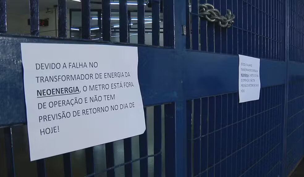 Na estação Shopping do Metrô-DF um aviso foi colocado para os usuários do transporte no sábado. “Devido falha no transformador de energia da Neoenergia, o metrô está fora de operação e não tem previsão de retorno no dia de hoje”, informou a nota (veja foto acima).