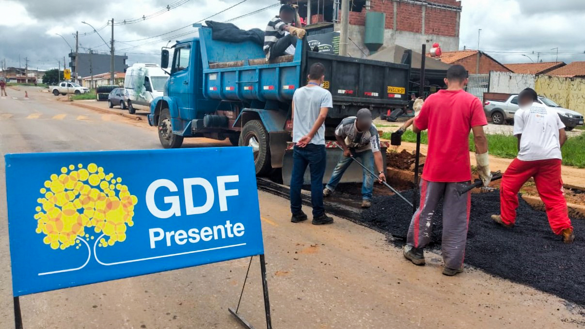 Para dar conta de um enorme buraco que abriu em uma das pistas da Via N3 – mais conhecida como 100 Dimensão -, na última quinta-feira (23), uma equipe de oito homens foi mobilizada. Foram utilizadas na operação cerca de cinco toneladas de massa asfáltica cedidas pela Novacap. “Era um buraco enorme, cabia um carro dentro, daí recuperamos o trecho danificado, obra que aconteceu num dia só”, conta o coordenador Carlos Alberto.