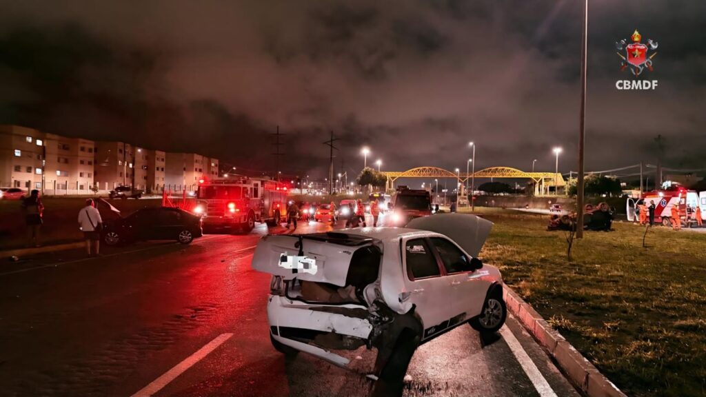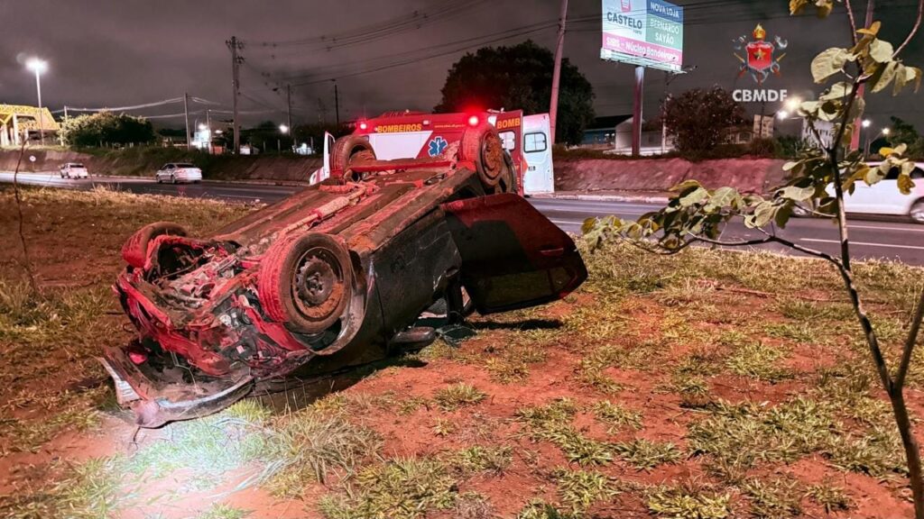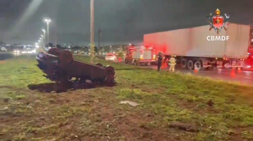 Em um vídeo divulgado pelo Corpo de Bombeiros Militar do Distrito Federal (CBMDF), é possível notar o estrago generalizado no local. O carro, envolvido no capotamento, ficou com as rodas para o ar. Veja o registro a seguir: