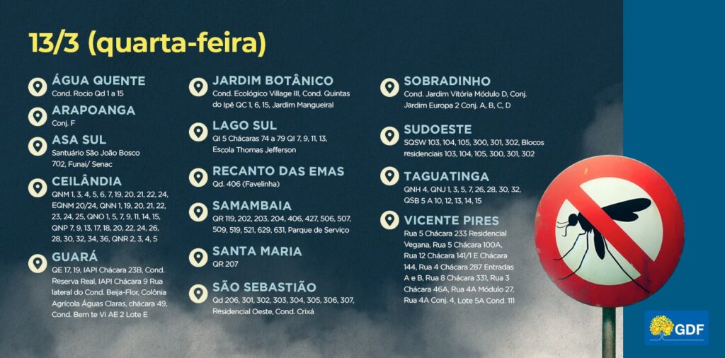 Distrito Federal Veja a rota do fumacê nesta quarta-feira (13) Recomendação da Vigilância Ambiental é que as pessoas abram portas e janelas de suas residências quando passar o veículo do inseticida de ultrabaixo volume (UBV), para maior eficácia do produto; aplicações serão feitas das 4h às 6h e das 17h às 19h Última Atualização 12 de março de 2024 21:55 Publicado em 12 de março de 2024 Compartilhar Foto: Divulgação/Agência Saúde Compartilhar Arte: Agência Brasília Fonte: Agência Brasília Você também pode gostar de ler Retrospectiva 2021: confira as principais notícias de outubro Campo da Esperança: chão cede e túmulos são abertos Tráfico de drogas: placas de haxixe de R$ 120 mil são encontradas em sacos de ração nos Correios GDF e moradores se unem contra descarte de lixo irregular no Itapoã Crianças do Projeto Plenarinha recebem água da Caesb TAGGED:Destaque Compartilhe esta notícia Facebook Email Print