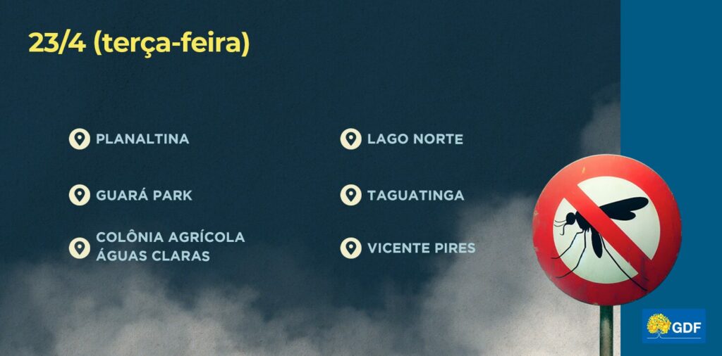 Distrito Federal Veja a rota do fumacê nesta terça-feira (23) Recomendação da Vigilância Ambiental é que as pessoas abram portas e janelas de suas residências quando passar o veículo do inseticida de ultrabaixo volume (UBV), para maior eficácia do produto; aplicações serão feitas das 4h às 6h e das 17h às 19h Última Atualização 22 de abril de 2024 21:32 Publicado em 22 de abril de 2024 Compartilhar Foto: Tony Winston/Agência Saúde-DF Compartilhar Arte: Agência Brasília Fonte: Agência Brasília Você também pode gostar de ler Entenda como é feito o trabalho de acolhimento de pessoas em situação de rua Partidos têm até dia 31 para pedir registro de federações partidárias Festival seleciona espetáculos do DF para apresentações no Rio de Janeiro Desligamentos de energia serão feitos em regiões do Riacho Fundo e de Samambaia Áreas de Águas Claras terão desligamento de energia neste sábado (5) TAGGED:Destaque Compartilhe esta notícia Facebook Email Print