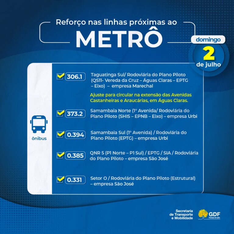 Haverá viagens extras de ônibus, conforme demanda, em algumas linhas que circulam em Samambaia, Ceilândia, Taguatinga e Águas Claras.