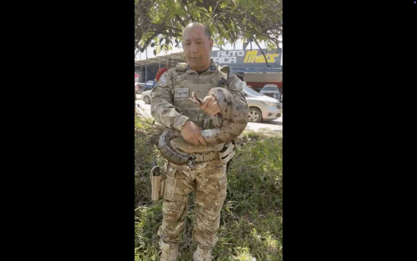 Em um vídeo divulgado pelos agentes, mostra o momento em que a cobra é contida, com cuidado, por um dos policiais envolvidos na ocorrência. Confira a seguir: