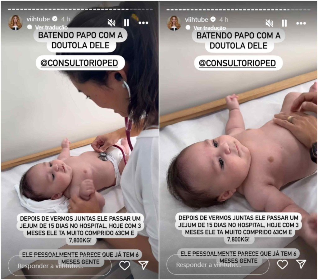 “Depois de vermos juntas ele passar um jejum de 15 dias no hospital, hoje com três meses ele está muito comprido. 63 centímetros e 7,8 quilos. Ele pessoalmente parece que já tem seis meses, gente”, celebrou Viih ao registrar o pequeno sendo examinado.