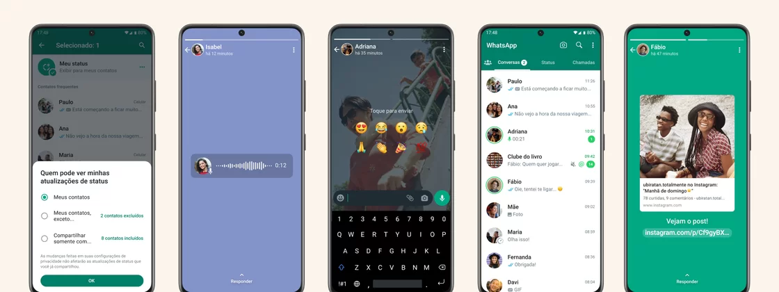 Entre as novidades do WhatsApp, há um “seletor de público” bem parecido com a função “melhores amigos” do Instagram. Com a ferramenta, o usuário consegue escolher quais contatos poderão ver as publicações de status. Nas configurações de privacidade, será possível escolher amigos e familiares mais próximos em cada status que for adicionado. Essa seleção é salva como padrão, mas também poderá ser atualizada sempre que o usuário optar.